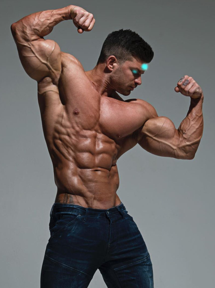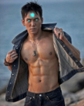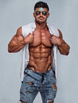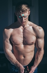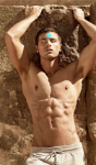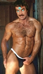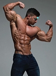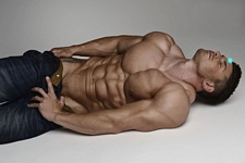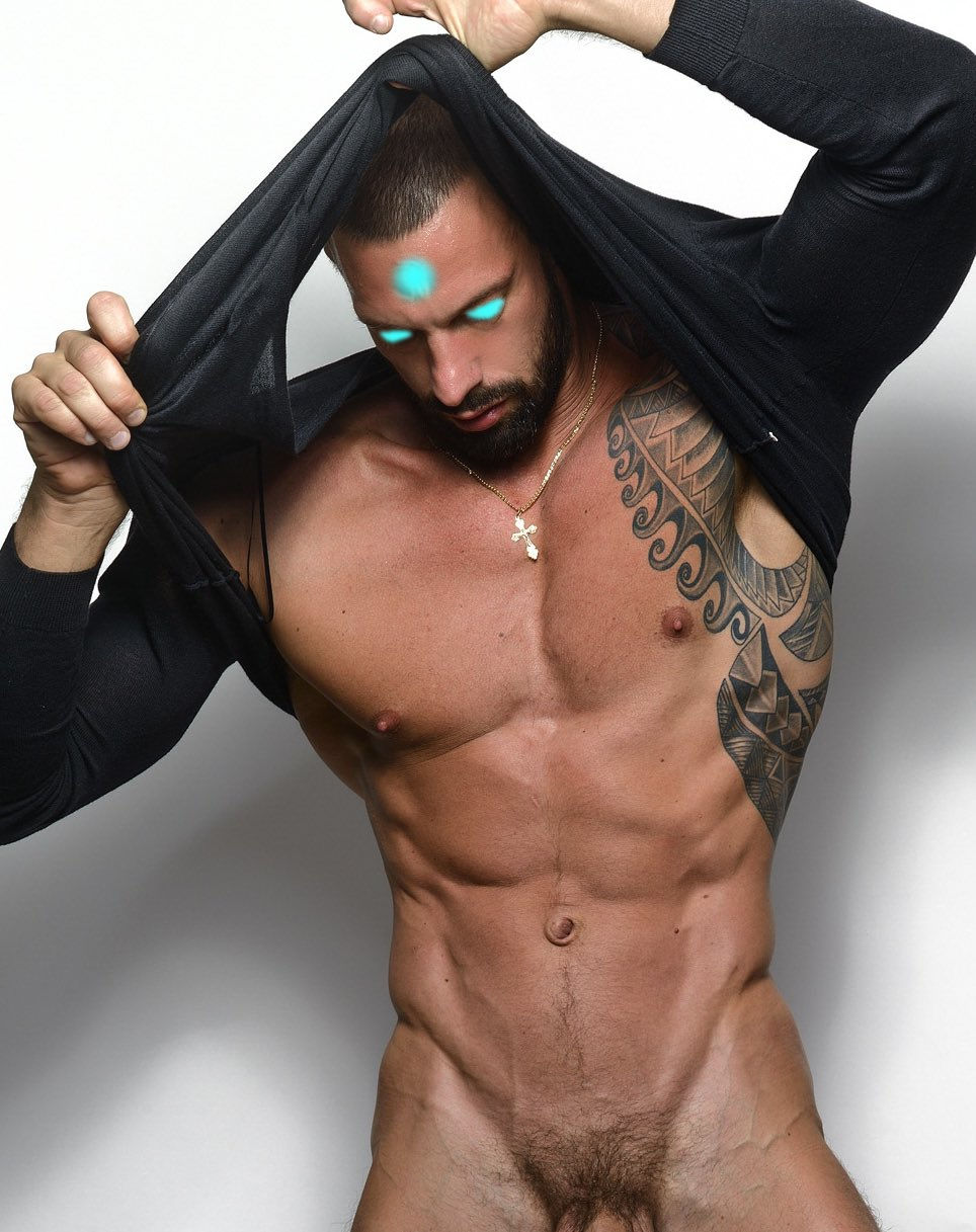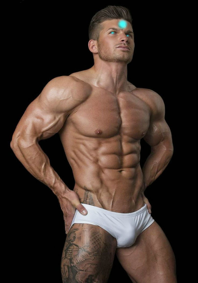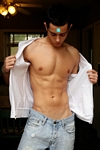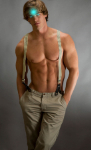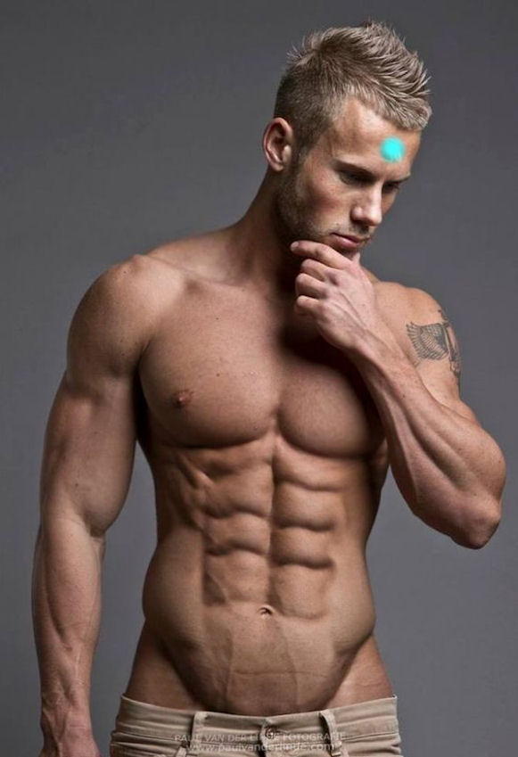 The jacket was off, and the shirt unbuttoned. He pulled it off, the chords in his arms tightening as he threw it away. His chest was broad, his abs tight, his Apollo's belt pointing down to his still concealed crotch.