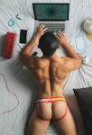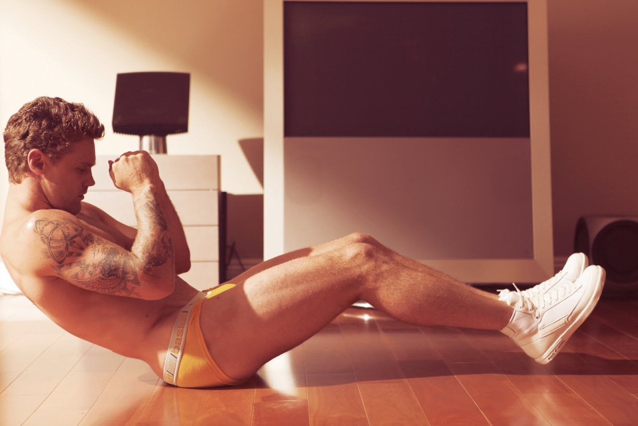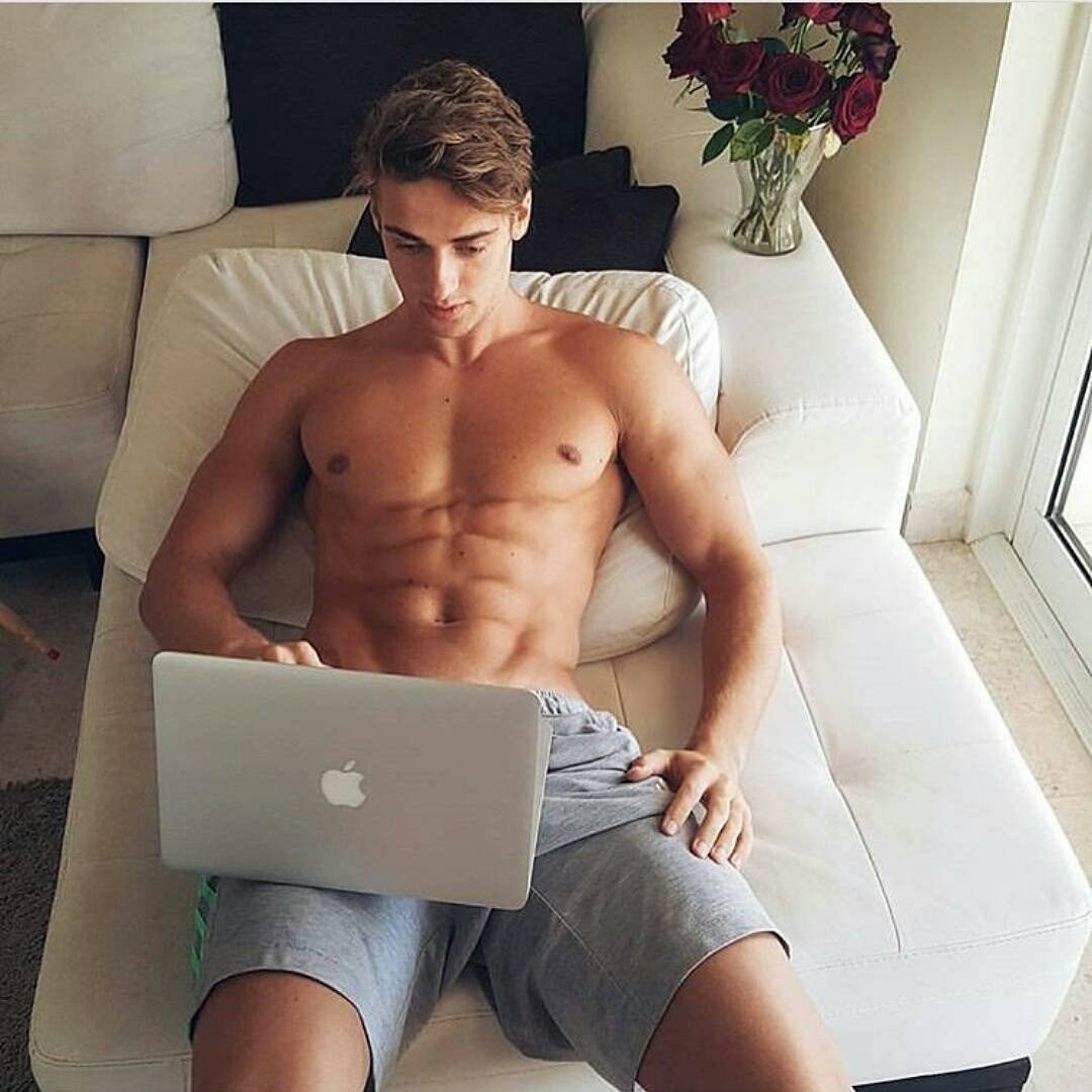 Darius was laying on his couch, wearing only underwear. His laptop was sitting on his thighs. He was barely aware of anything but the voice commanding him. His right hand was behind his head, and he flexed as ordered.