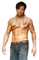 Cautiously, he walked to his bedroom and looked inside. A stranger lay on the bed, his upper body against the headboard and the sheets covering him up to his waist. He was not wearing a shirt, revealing a moderately hairy chest above the stomach. The man was young, tanned, well-built but not overly muscled, with dark wavy hair just above his shoulders.