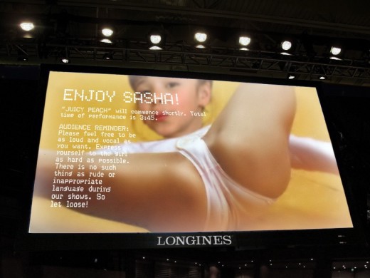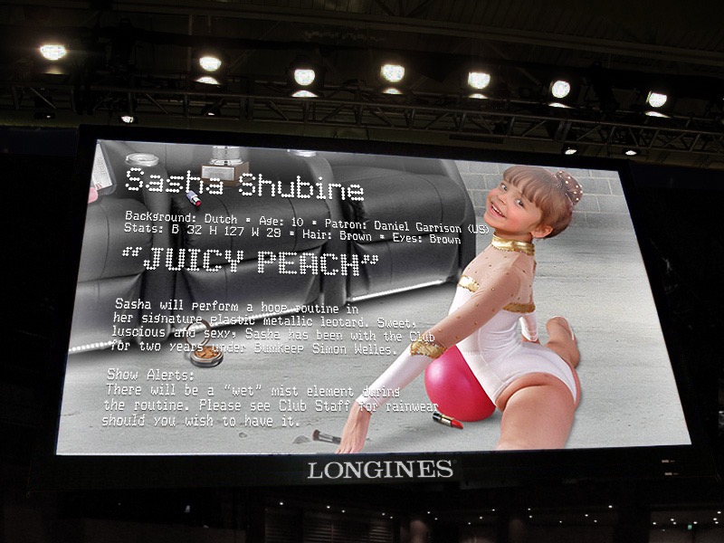 He gestured and for the first time I noticed the TVs that hung from the ceiling on invisible cords, angled down to give the patrons a good display. A young girl about the age of 10 was featured on the screen, in a pink leotard, smiling and with her head tilted back and doing the splits. "SASHA SHUBINE" was prominently titled across the top, and a countdown was ticking in one corner with just under 5 minutes left.