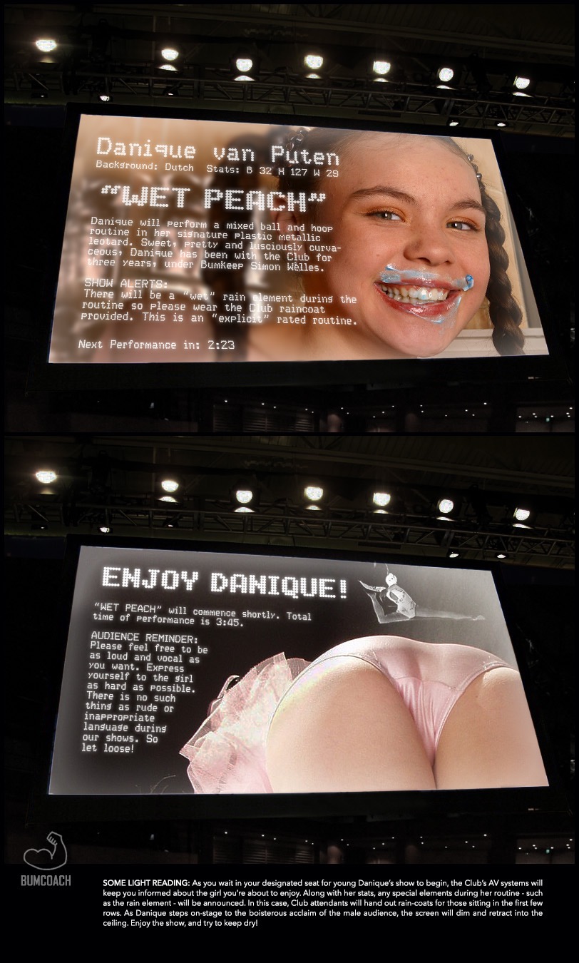 It was over, I realized, as Natalia bowed to the audience. I was sweating, my cock thumping in my pants like a tortured drum. She incorporated the ball into her bow, rolling it across her arms and shoulders as she faced each side of the stage. Then she faced away from the crowd, giving a mock bow and thrusting her butt and her exposed little pussy into the air. The glossy shine of semen around her exposed genitals reflected brightly under the harsh spotlights.