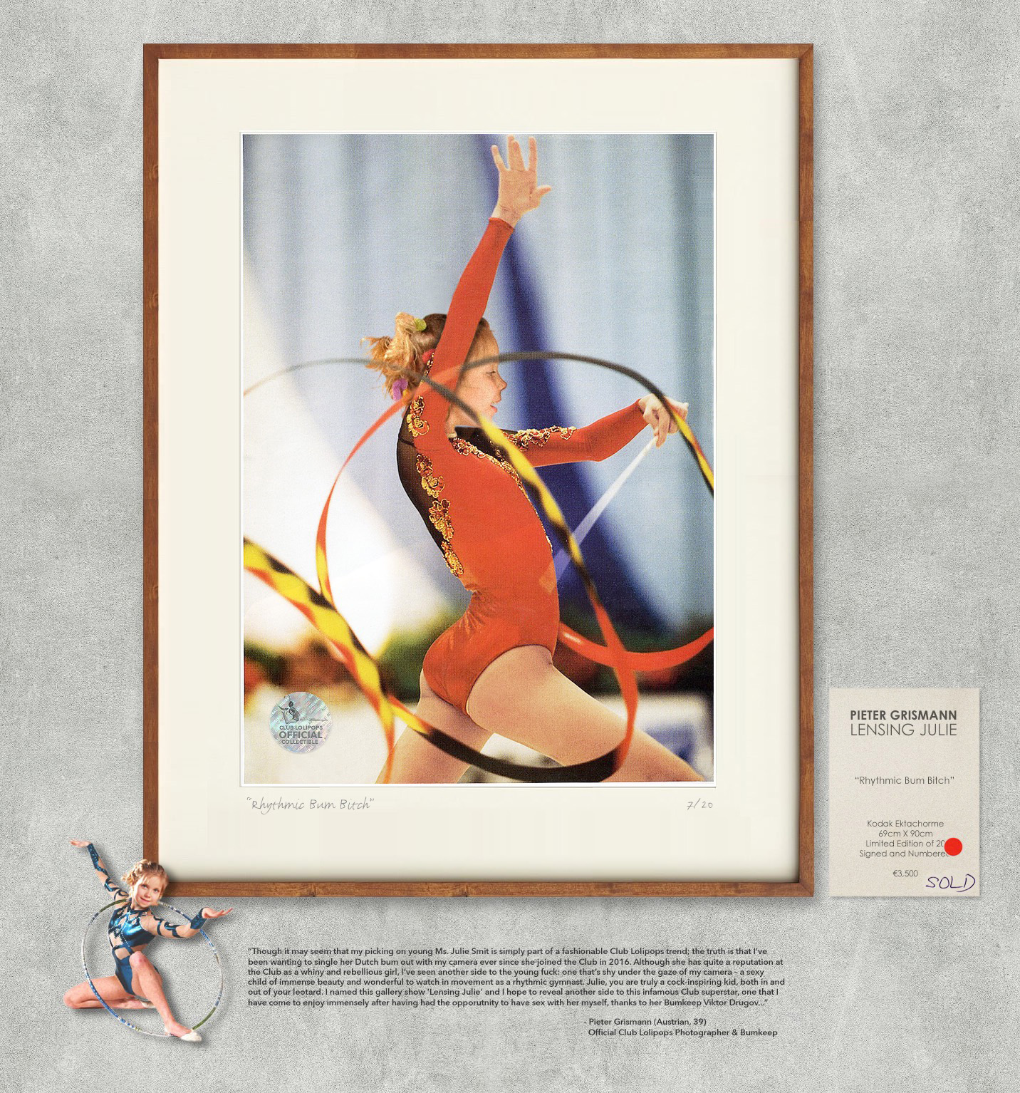 A shining black border and glass encased a full-size poster: a brilliant photograph of the profile of a gorgeous young girl twirling a ribbon, its spiraling arc filling the frame. Her luscious blond pigtails were frozen in time, captured at the apex of a graceful movement. I took in the orange leotard stretched tightly over her girlish form, hugging her hips, and goggled at the translucent back section that swept from her shoulders all the way down over her butt. The thin black mesh revealed everything, hugging the rear of her waist with seductive ripples and straining where it cupped the perky slopes of her bottom.