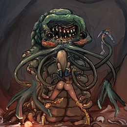 Sensing a presence, she whirled around. The epitome of ugliness towered over her from behind, a heavy worm-like body rising from the shadows, bloated, deformed, a mottled ruin of sickly slime and gangrenous flesh. Pointed tentacles whipped out and snatched her off her feet.