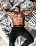 Chandler had been instructed to masturbate, without cumming, until the master arrived. Now he was in his own world. Eyes closed, head thrown back, only wearing pants, he leaned against a wall. He was jerking off with his right hand as his left cupped his right pec.