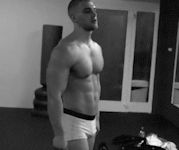 Immediately pulling the black short pants off, he now stood in boxer briefs. His excitement at standing before his master was now impossible to hide. Lifting up his arms, he flexed again.