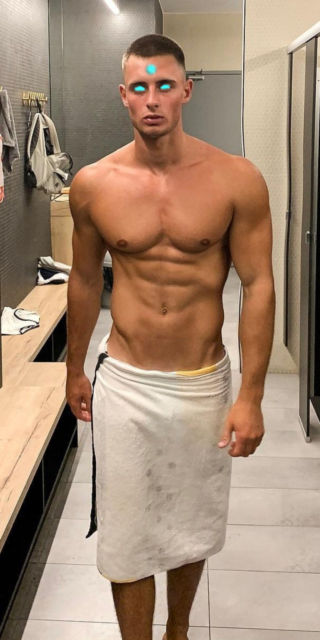 "Seems you like what you see," the stranger said, looking at Aiden's crotch. "I think that buzzcut doesn't do you any favors. Besides that, I'm liking what I'm seeing. I'd like to see more."