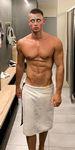 Finishing showering in the locker room, he wrapped a towel around his waist. He headed back to his clothes to get dressed and leave.