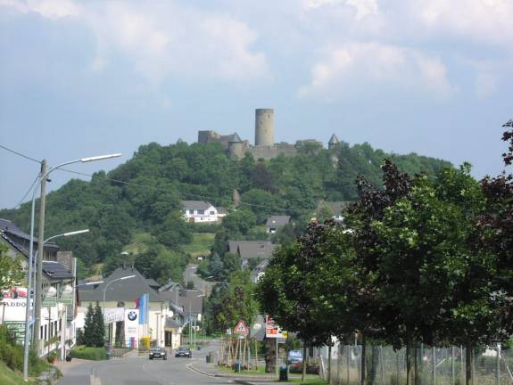 How undignified! We barely got ourselves settled before we set off and we were soon climbing out of town towards Nürburg. This bus takes the long way up through the race circuit emerging up near the Grand Prix circuit. Not that you could see anything but we could hear cars or something being given some well around the ‘Alte' circuit, hmm maybe I'll have to come up on a race day. The bus paused briefly in the village and I could see the castle looming high above the Eifel.