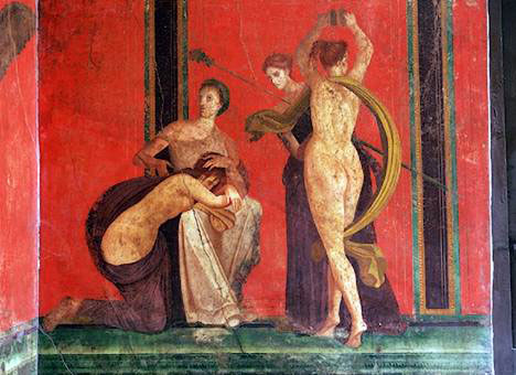 The Romans loved Greek erotic pottery and they also painted sex on their dining room walls. At the Villa of the Mysteries in Pompeii were frescos of an initiation rite involving naked women being whipped. For breakfast? Well, to each his own. Let me also point out that no dignified Roman Matron would have had a house without an erect penis right near the door to ward off evil spirits. The Romans also used figures with an enlarged penis that had bells attached called tinntabulus to keep evil spirits away. If one penis was good then five must be better. Each little dick would have had a bell which tinkled in the wind.