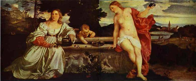 One of the Titian paintings that have always fascinated me is his Sacred and Profane Love. Now we modern Anglos with our ingrained prudery would assume the nude was profane and the dressed lady sacred. But art historians agree that it is just the opposite. The nude represents purity and lack of corruption brought about by wealth in civilization. Wouldn’t it be nice to get back to that purity of understanding that the naked human body is the most beautiful and perfect measure of our world? That sex is a natural and wholesome pursuit, not the sin the Church made of it.