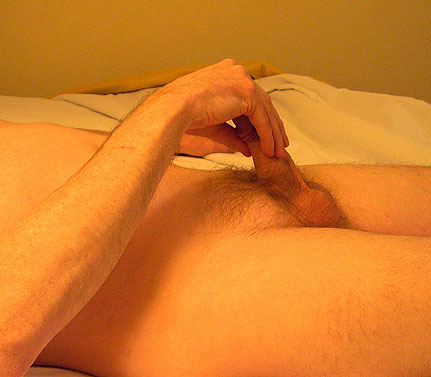 Then taking the erect penis loosely between fingers and thumb as if writing a letter. Let the penis head gently nestle in the valley between thumb and forefinger. Then slowly begin to move your hand up and down, allowing your erect penis to slide in and out of the valley formed by thumb and fingers.