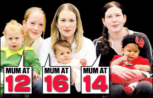 Both Jemma and Jade are still at school. Jade, now 15, is about to take four GCSEs. Jemma told last night how Jade introduced her to the lad who became T-Jay’s father. She said: “I didn’t tell anyone I was pregnant because I was too scared. “I only told my boyfriend David, who was 14 at the time, but I didn’t want to have an abortion. “He was my first love but now I’m gutted because he doesn’t want to have anything to do with me or T-Jay. “He was great to start with but he’s got a new girlfriend.” Jade said she became pregnant with Lita after a one-night stand. She said: “It was just one of those things really. I wasn’t using contraception and I suppose I just thought it wouldn’t happen to me. “I didn’t tell anyone for ages as I initially wanted an abortion, but I couldn’t go through with it. Her dad knows about her but doesn’t want to have anything to do with her and doesn’t contribute anything. We’ve put the Child Support Agency on to him. “But we don’t need their dads as we give them all the love and support they need.” Jade hopes to go on to sixth form and eventually to get a job involving computers. Natasha is still with Amani’s dad, who she describes as a 38-year-old gambler. She added: “He comes to see her from time to time. But he’s Asian and still lives with his parents — they don’t know about me or Amani. “Hopefully I’m going to get a house of my own. I’m on the council waiting list.” |