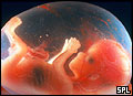 The foetus is about 5cm long with its head tucked onto its chest. It has most its major organs and eyes and ears are developing.