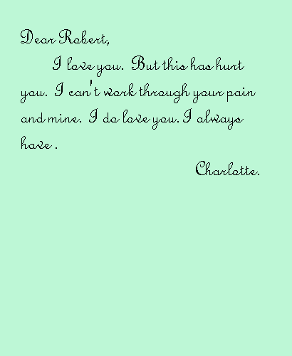 "Stop, Charlotte." The figure, Robert, had moved to her side. He placed his hands over hers, calming them. "They've got a tube in your throat to help you breath. Don't try to talk until I can get them to take it out. I'll get a nurse."