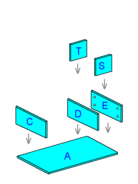 Take another sheet of plywood and cut it into pieces according to the following diagram. Mark the part letters on the rougher surface of the wood, because that's the surface that will be facing INSIDE.
