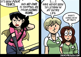 Shortpacked! and Dumbing of Age!: Two web comics by David Willis. Shortpacked follows the lives of toy store employees, with occational aliens and such, while DoA starts over with characters from his various series back as college freshman. It's the comic that did gay and lesbian topics so well the QUILTBAG webcomic creator quit @_@