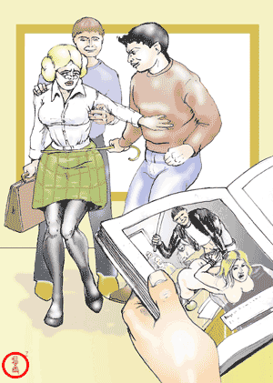 "Nope!" said Graham, as he put an arm around the woman's waist. "Not until we've helped you to live out your secret longings!" He hugged her and then kissed her on the lips. While the diminutive teacher struggled to get away from Graham's embrace he ran his right hand up the outside of her left leg and cupped a plump cheek, scandalously clad (for a Purity League devotee)in black lace.