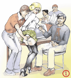 She was staring at a full page illustration of a woman, naked apart from black stockings, pumps and the ubiquitous mortarboard, bent over a desk being entered from both front and back by two extremely well endowed young men. In the background another is keeping a tally on the blackboard while the rest of the class has formed a line.