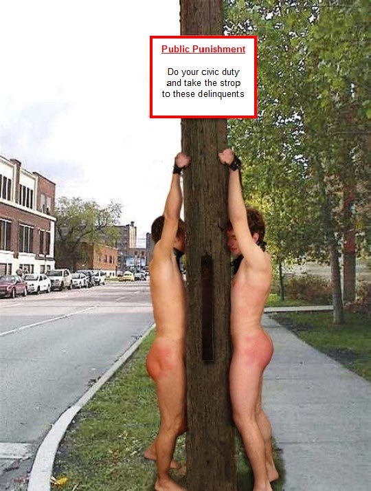 The following story is fiction about CP in public. The story contains scenes of strapping. If this subject is offensive, uninteresting or if you are a minor (i.e., child) please leave now. I was inspired to write this story by this image: images/WhippingPostBoys.jpg which I found in several places on the web without attribution and a mis-spelt sign which I changed. You can enlarge it with a mouse over or a touch on the thumbnail image or click for full size.