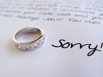 13: The picture is of a letter signed "Sorry!" with a wedding band. What is this letter about? Here's one answer.