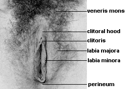 top to bottom can be clearly seen the clitoris, urethral opening, and vaginal