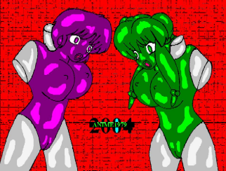 But it was too late. Her swimsuit was already beginning to turn green, and her arms were being pulled into the suit. She cried out and closed her eyes in a vain attempt to stop Akane from emerging. A purple-clad Akane began to force herself out of the back of Shampoo. First to emerge was her purple-clad breasts. Then her determined head emerged from out of the back of Shampoo. Soon the pair of them made up the same two-headed, two-legged beast they had been before. Minutes passed as both of them struggled for dominance.