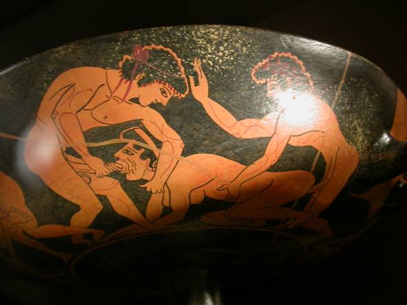 All of the ruckus over Jerry Sandusky would not have made sense to the Greeks. In Classical Greece it was accepted and even expected that a young boy would form a friendship with an older man. The older man would serve as a mentor and a level of love would naturally develop between the two. That love would be expressed quite naturally. In Greek pottery popular themes and images were used over and over. For example, here is one popular image used in two different pottery pieces, an older man with an erection fondling a boy called Man courting young boy. Courting, what a wonderful euphemism. Now remember, this is museum art so it is okay. We don't need to get squeamish over Art with a capital A.