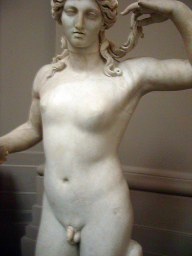 Okay, we have had girl on girl, man on man, man on boy, and man on a woman sex how about another type of sex in our public museum tour. A very popular God for the Greeks was Hermaphroditus, the child of Hermes and Aphrodite, the male and female Deities of sex, whose other son was Eros, also known as Cupid. Hermaphroditus was a mix of the two, half man – half woman, a true transgender. Velasquez is supposed to have modled his Venus on the Sleeping Hermaphroditus in Rome, just the backide. There is a famous Hermaphroditus in the Louvre, right out in public as well, the most visited museum in the world, children too. No wonder those French think Jerry Lewis is a great comedian. Their brains have been rotted by all of the sex in their museums. But my favorite is this one, called the Lady Lever Hermaphroditus, part of the British Museum. Her body and face so feminine and the hand holding a lock of hair. What a beauty! Lovely breasts, but also a, a ...penis! This is all so confusing.