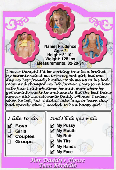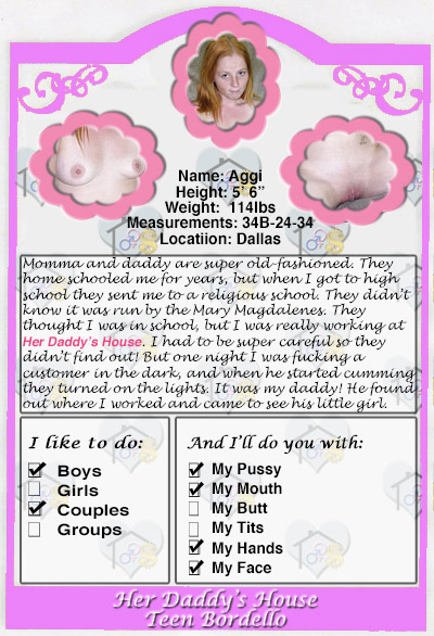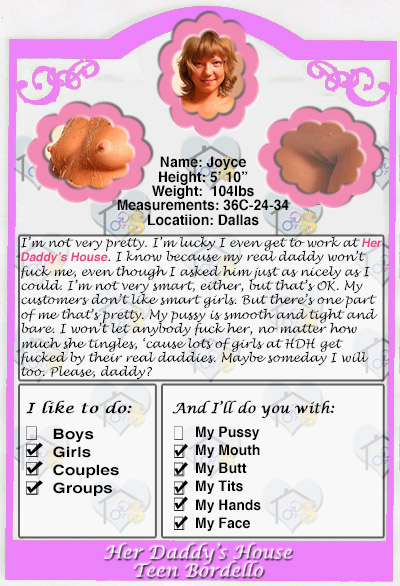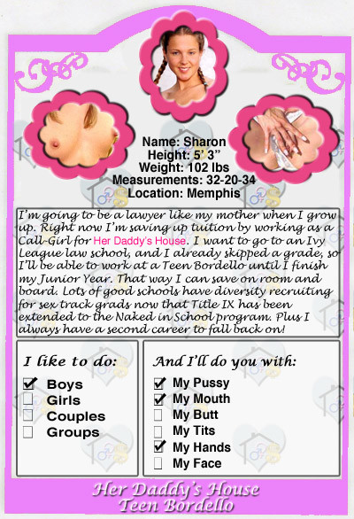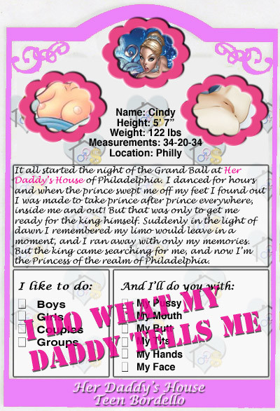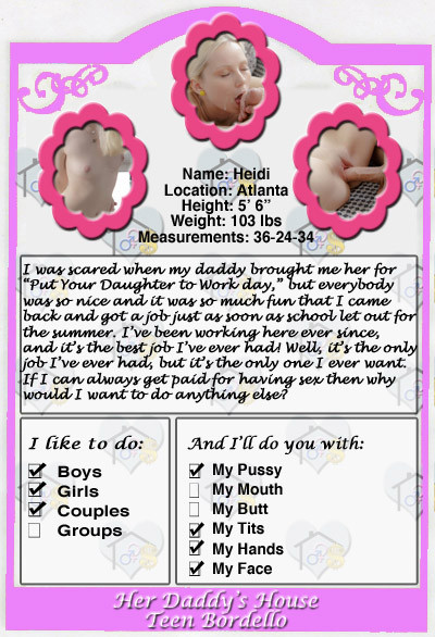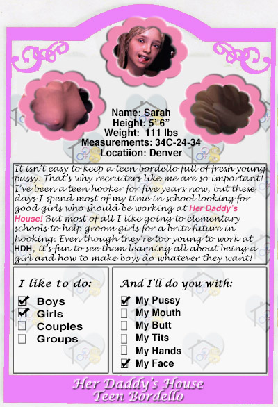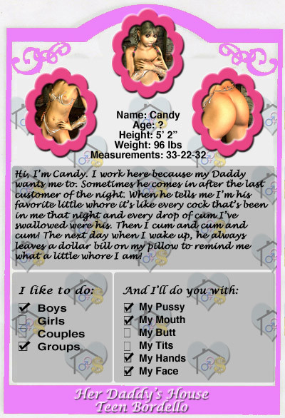 I was shocked when daddy dropped me off here. All week I was looking forward to "Take your daughter to work day." I wanted to see what my daddy did all day in his office, but mainly I was just looking for a day off from school. When we drove right up to Her Daddy's House I couldn't believe he wanted to leave me there! At first I cried and said I wouldn't get out of the car. Daddy was nice and explained to me that he and Momma thought that I would really like working in a nice fun teen bordello, especially since I'd been acting like a little whore ever since I turned 13. He said that I was old enough to start working to help take care of all my brothers and sisters, and that it would be great if mom could quit her job and stay home from now on. That didn't work, but when he told me the manager would send men out to drag me inside I gave in and went in.