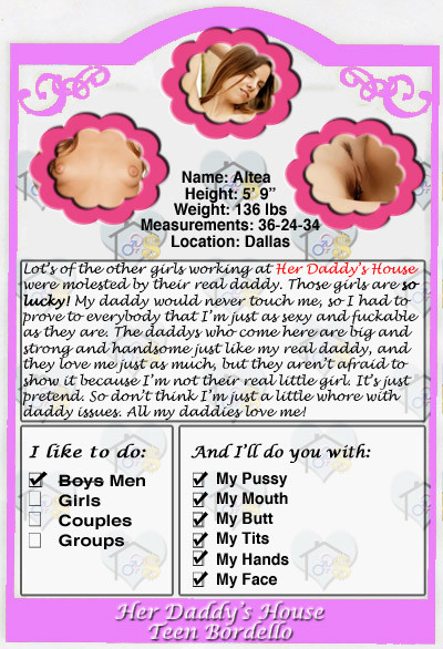 When I found out I could work at Her Daddy's House and get fucked by lots of other daddies every night I just had to try it out. My real daddy was out of town on business for a month, so I didn't get caught until he came back. By that time I knew I was getting just what I needed, so I didn't even care when he called me a little whore and told me he never wanted to see me again. That's how I know I don't have any daddy issues, so if you're looking for a girl that reminds you of your daughter, check out my pictures. If I look like her, come on in and give me a try. But remember, I'm still kind of naughty so you might have to spank me!