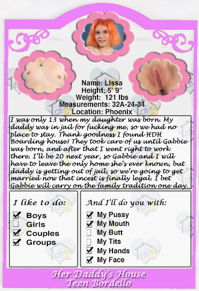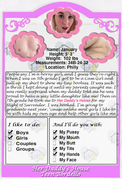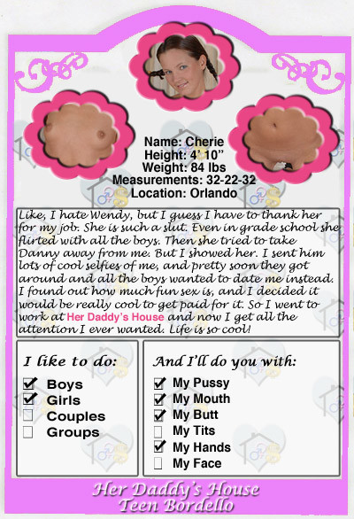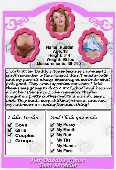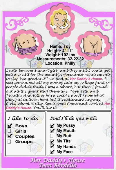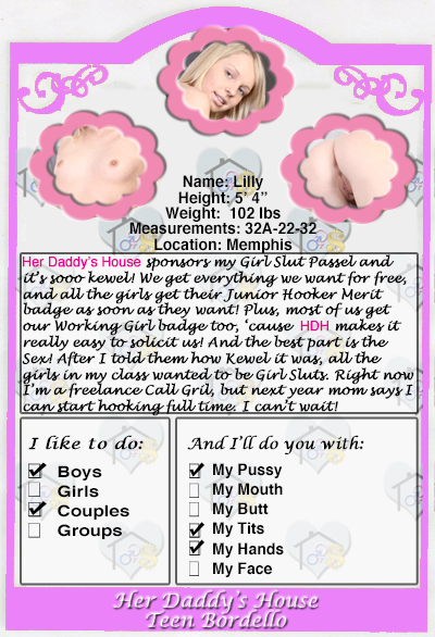 After we found out how much fun fucking was we just couldn't get enough, so we started up a family prostitution business and all three of us girls were selling our pussy most every day, sometimes several times a day. Mom was having trouble finding enough time to do her regular job and still turn all the tricks she wanted, even though daddy helped out by driving us to our "dates" and managing the money. And there was a lot of money! Fortunately daddy is a very smart man, and he invested the profits in Her Daddy's House Teen Bordello right here in Brookside. When the manager took a different job, daddy took over and just naturally brought Kittycat and I right into the business! So take it from me, girls, Brookside Village really is the Perfect Place to Raise the Perfect Daughter! And parents: Take it from me, your sweet little girl is sitting on a gold mine! Wouldn't you like to come home to find her watching hard core porn and arguing with her sister about whose tits are bigger? Wouldn't you like to go to Lolita Nite at the Pink Pussy to see her headlining a cock sucking contest and coming home covered in jizz? Call up my mom or click on 'Lilibeth Smith' on the Brookside website to make an appointment to turn your innocent little angel into a sex obsessed teen whore! Mom's expensive, but after all, what better investment is there than your daughter's tight little pussy?