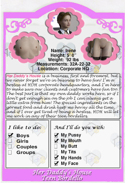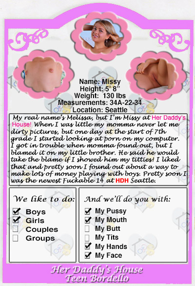 Then one day he found a website called The Horniest Place on Earth, and they had lots of stories from girls working at Her Daddy's House Teen Bordello. I found out girls my age could make a fortune working there, having all kinds of cool sex for money. There wasn't an HDH for hundreds of miles from my little town in Nebraska, but I went to the P.A.P.A.S website and asked if they could help me get a job, cause they said they like to help pretty young girls escape "sexual oppression." Roy took naked pictures of me and PAPAS sent them to HDH. A week later I had an airplane ticket to SEATAC, and two days after that I was the newest Fuckable 14 at HDH Seattle.