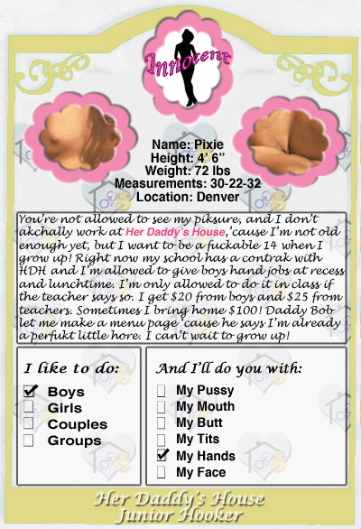 I loved being his sweet little whore! I had to drop out of school so I had time to recruit girls and still work a regular schedule at HDH. It's really rewarding to find a shy little girl just entering adolescence and help her blossom into a Fuckable 14 before she even hits her fourteenth birthday. I think we have the best Teen Bordello in the whole HDH chain, so cum by and take our tour so you can decide for yourself!