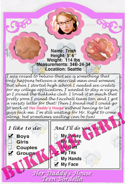 I joined the Bukkake club that day, and by the next week I was the youngest member of the Faceball Team. I liked it so much I got a varsity letter that semester, and I'm not worried about graduating anymore, cause one of my teammates told me I could be a Bukkake Girl at Her Daddy's House. I work there two days a week and one day on the weekend now. Remember I said I was horrified when I first went to Bukkake club? Well now I've been whore-ified. I'm still a virgin, but if you like cumming on pretty faces, you should give mine a try! I never get enough.