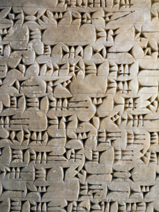Western printed letters are lines and curves, the capitals from Roman inscriptions and the minuscules from Charlemagne's scribes. Cuneiform is writing done on clay tablets with wedges and stokes. It is carved into stone for inscriptions. It was invented by the Sumerians and used by the Akkadians to represent their language. Other Semitic speaking people picked it up and adapted it, as did the Indo European speaking Hittites. The Assyrians developed it into an art form. The clay tablets are fragile and care must be taken when excavating them. They can be destroyed by an armored vehicle driving through an army base built on an ancient city mound, as the American's sometimes were. When cites were burned the clay was inadvertently baked and the tablets became nearly indestructible. Records on paper, such as those of the Greeks and Romans, must be recopied through the centuries or they are lost. Gilgamesh and other literature from Sumer and Akkad was recopied by scribes of early Babylon and Assyria, but from then on we have original sources, the actual letters and documents written by kings and administrators, not later copies of them. Orientalists tried for decades to decipher cuneiform, but no progress was made until a German high school teacher and amateur cryptologist made a start. He recognized an inscription as the name of a king and his father, and went through king lists until he found ones of the right length that matched up. It was several more years before anyone paid attention to his work. The Asian lion ranged from Palestine to India up until the middle ages. They were symbols of strength and courage since the lion and bull were the most powerful creatures or things known, as the steam engine was later. Lions were thought to be watchful and sleep with their eyes open. Inanna was shown standing on a lion or a pair of lions, and carved or mosaic lions often stood at the entrance to her temple. They are still seen at the entrance to libraries. A lamassu is an Assyrian protective deity depicted as a winged lion or bull, usually with a human head. Enormous reliefs of them stood at the entrance to cities, and ones inscribed on clay were buried beneath the thresholds of houses. Both of them are companions to God in the Christian Bible, and they are symbols for St Mark and St Luke. Egypt borrowed the idea for the guardian of the pyramids, the Sphinx. A guardian spirit is now represented as a winged human. The Greeks thought of the one who watched the Minoan Labyrinth as a demon, so the Minotaur became a bull with a human body. Reliefs from Nineveh now in the British Museum show the king hunting lions from a chariot. There were no lions on the plain at the time, so they had to be imported from the mountains. Only kings were allowed to hunt lions. Roman troops stationed in foreign lands got bored, so lions were used for entertainment. They would scoop up random members of the local population and watch lions kill and dismember them in the hundreds of amphitheaters they built for the purpose throughout their empire. Of course lions did not like to eat humans, so they had to be starved first. Herakles is most often depicted wearing a lion skin and carrying a club, although lions became extinct in Greece shortly after the classical period.